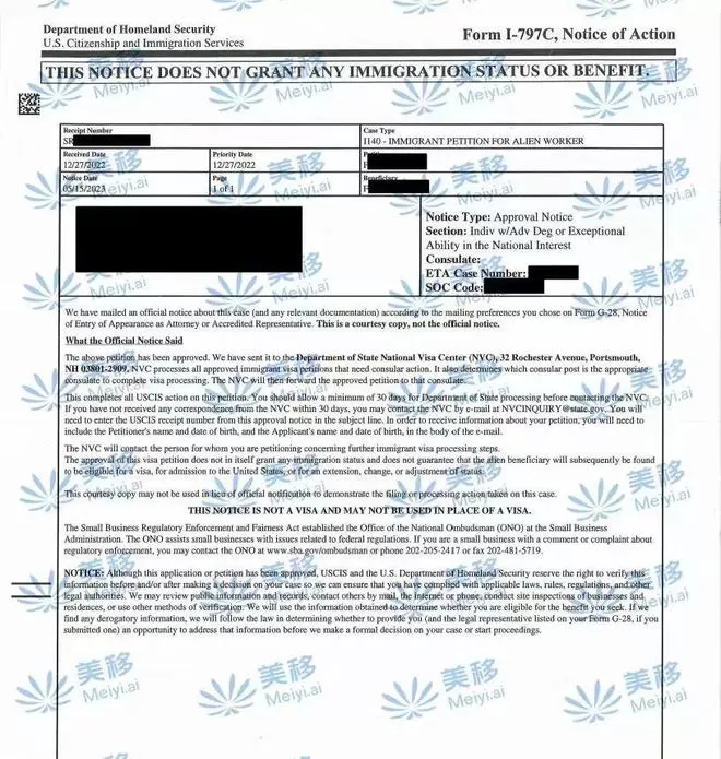 2023年5月15日,W先生得到了移民局批复,顺利获批I-140申请,全程无补件。