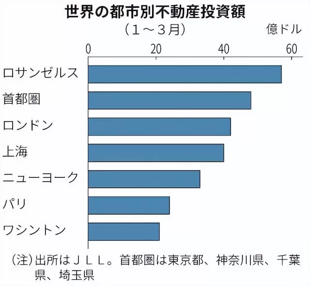 据日本房地产服务巨头JLL公布的全球城市不动产投资额统计,2023年1~3月日本首都圈的不动产投资额同比增长26%,达到约48亿美元,位居世界第2位,仅次于美国洛杉矶,比2022年同期的第14位大幅上升。