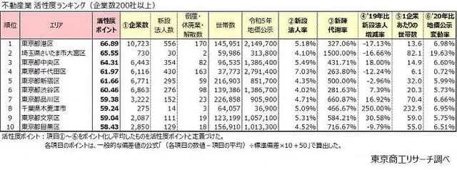 那首都圈之中哪里的房产又最适合投资呢?东京商工调查TSR以首都圈各地区的房地产行业为对象,从企业数量、新设法人率、新陈代谢率(新设法人对破产、停业、解散的比率)、地价公示增减率等几个方面进行对比,得出了首都圈房地产业的“活性度”排行榜: