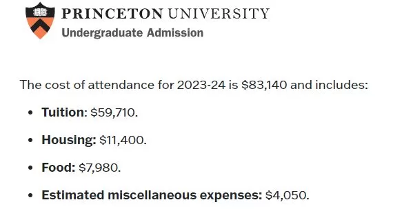 普林斯顿大学本科学费由57,410美元上涨至59,710美元,涨幅约4%,每年就读总成本高达83,140美元。