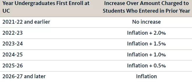 往年的“录取大户”UC系(加州大学),2021年,通过一项学费提案,宣布自2022年秋季开始,入学的本科新生和转学生学费都要上调,每年按照通货膨胀速度递增。