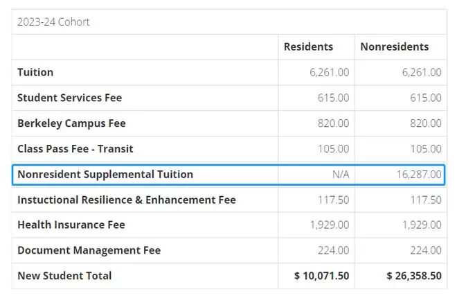 2023-24届本科生,本地生新生的一学期的总学费是$10,071.50,非本地生为$26,358.50,中间相差了$16,287,也就是11万人民币。
