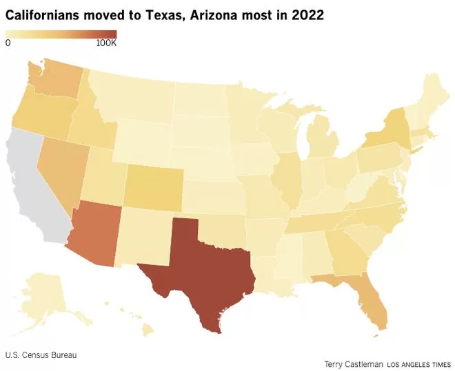 图表:2022年迁往德州和亚利桑那州的加州人最多(来源:洛杉矶时报)