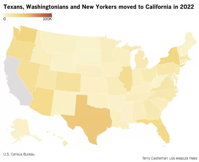 图表:2022年各州迁往加州的人(来源:洛杉矶时报)