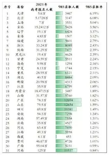 2021年高考的录取率,985高校录取率985平均为2%,211平均为6.4%。全国985最高录取率也才6%左右。
