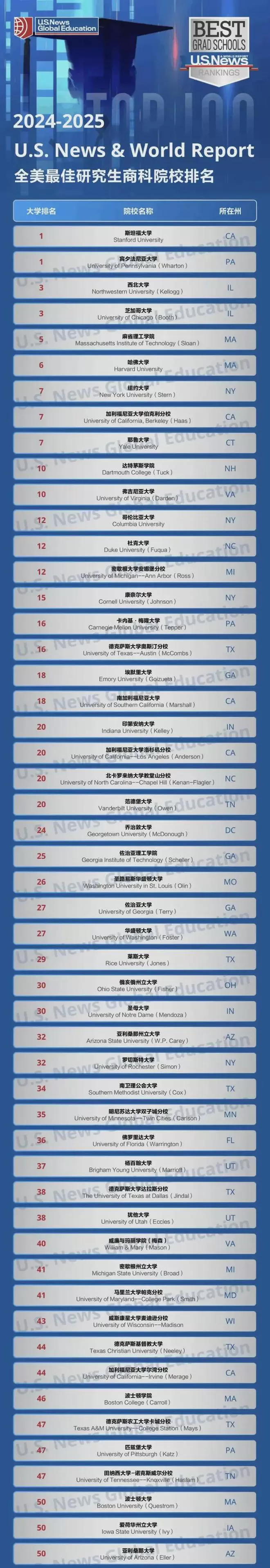 近日,2025年U.S.News全美研究生学院排行榜出炉。