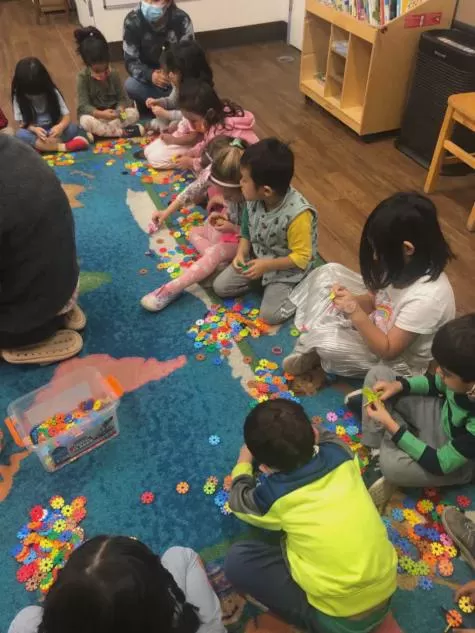 孩子小的时候,家长时常可以参与学校活动,孩子们一般都是围着老师坐在地上做活动,家长如果去参观,也是坐在孩子们中间坐在地上。